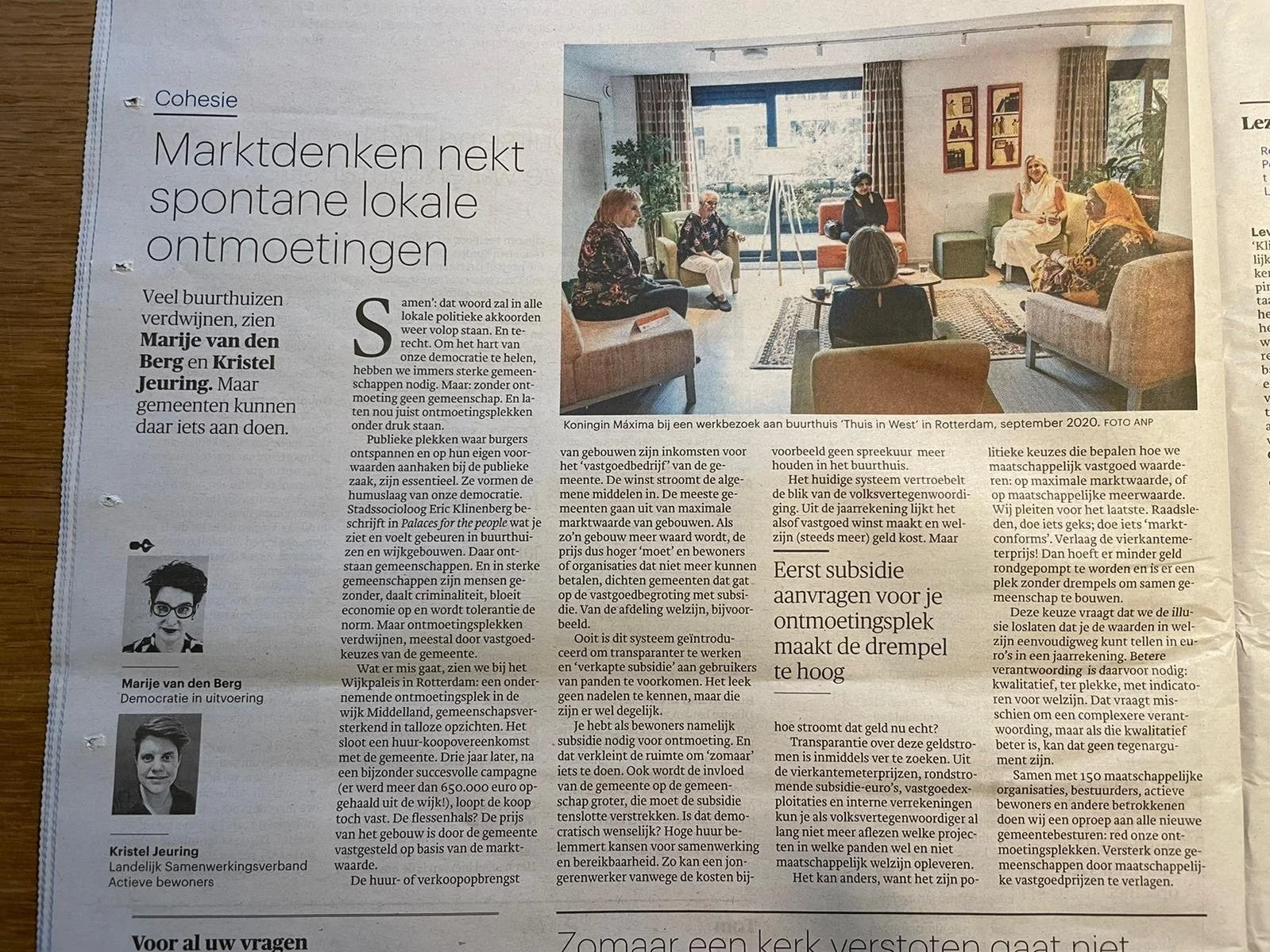 Publieke plekken waar burgers ontspannen en op hun eigen voorwaarden aanhaken bij de publieke zaak, zijn essentieel. Ze vormen de humuslaag van onze democratie. Stadssocioloog Eric Klinenberg beschrijft in Palaces for the people wat je ziet en voelt gebeuren in buurthuizen en wijkgebouwen. Daar ontstaan gemeenschappen. En in sterke gemeenschappen zijn mensen gezonder, daalt criminaliteit, bloeit economie op en wordt tolerantie de norm.